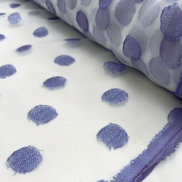 170cm wide, stupendously fine polyester in white with a cornflower blue satin spot all over design embroidered design on an organza base. This feather lightweight (48gsm) cloth is breathable making it ideal for warmer climates. It’s perfect for making statement dresses for special occasions.