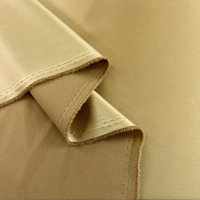 This stunning quality bridal satin fabric is the perfect choice for any special occasion dress. With a soft metallic gold hue, this fabric will add a touch of glamour and sophistication to your next design.