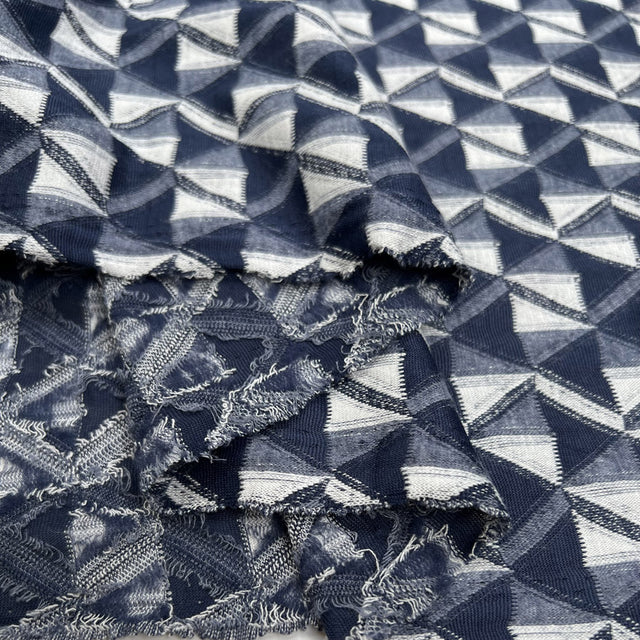 • 152cm wide, fine knitted jersey fabric with an interesting patchwork design in blue, white, and grey.