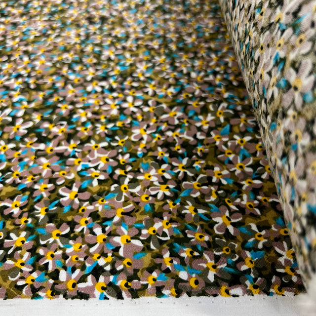 Green floral printed dressmaking fabric made from viscose, excellent for vintage-style tea dresses and wide leg floaty trousers!