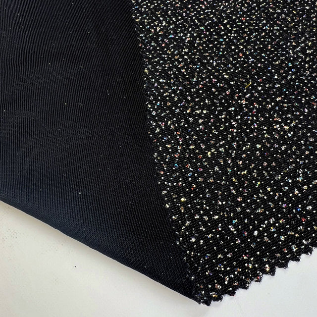 Dazzle the night away in our black knitted jersey fabric infused with multicoloured metallic yarns that catch the light with every movement. This stretchy material is perfect for creating stunning cowl neck tops that drape beautifully and add a touch of glamour to any outfit.
