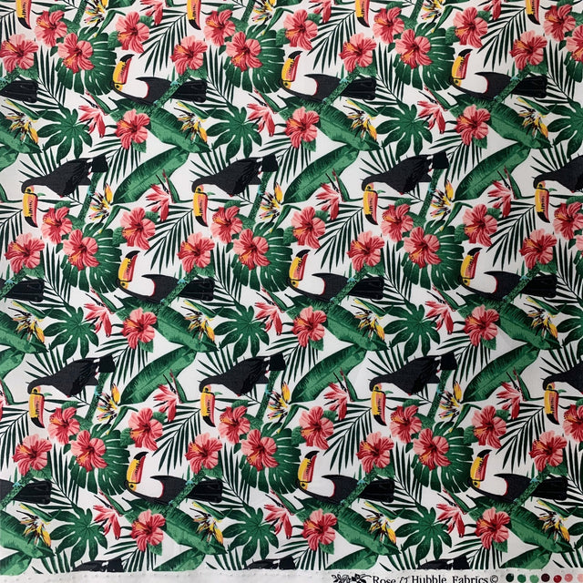 | 112cm wide, cotton poplin print fabric with a tropical toucan print on a white background | |