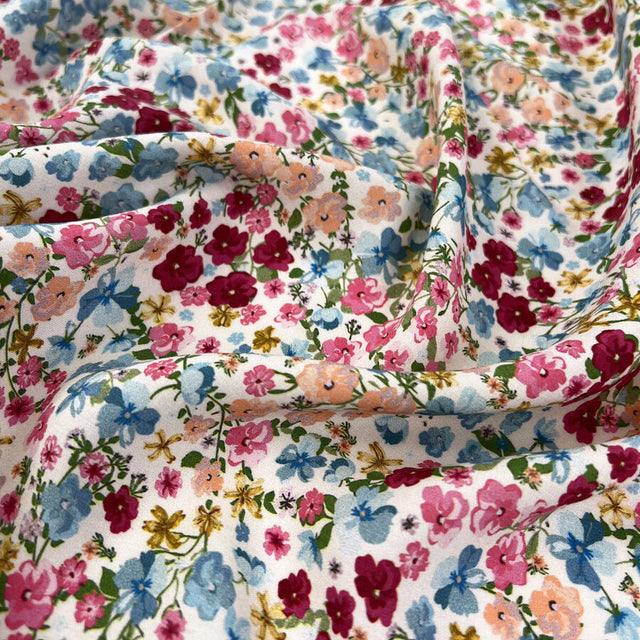 A charming 140cm wide, digitally printed 100% rayon fabric featuring a ditsy floral design in sky blue, rose pink, peach, and golden yellow on a soft creaam background—lightweight, breathable, and ideal for flowing summer pieces.