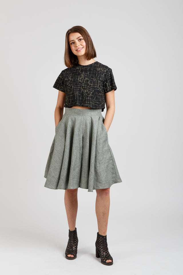 The pattern features a fitted waistband that accentuates your figure, along with deep pockets for added functionality. The invisible side seam zipper ensures a sleek and seamless look, while the hidden centre front and back pleats create the illusion of a flowing skirt.
