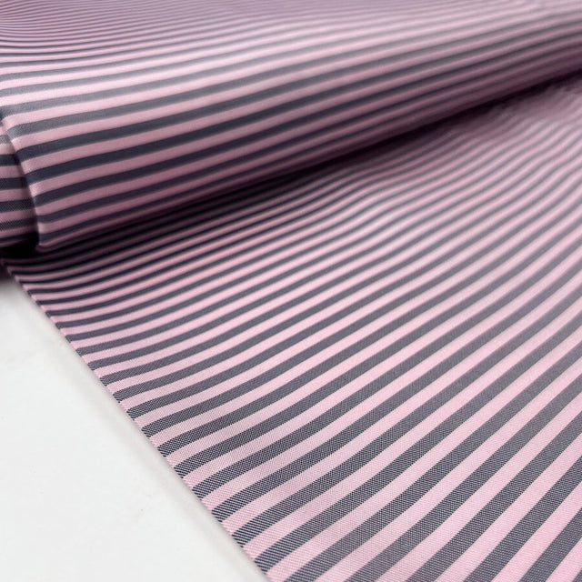 140cm wide, 74% acetate and 26% viscose lining fabric featuring a striking pink and navy stripe design. Smooth, breathable and luxuriously soft to the touch, this high-quality lining adds a polished finish to tailored garments. The pink and navy stripe brings a pop of colour and character, making it perfect for both classic and contemporary projects.