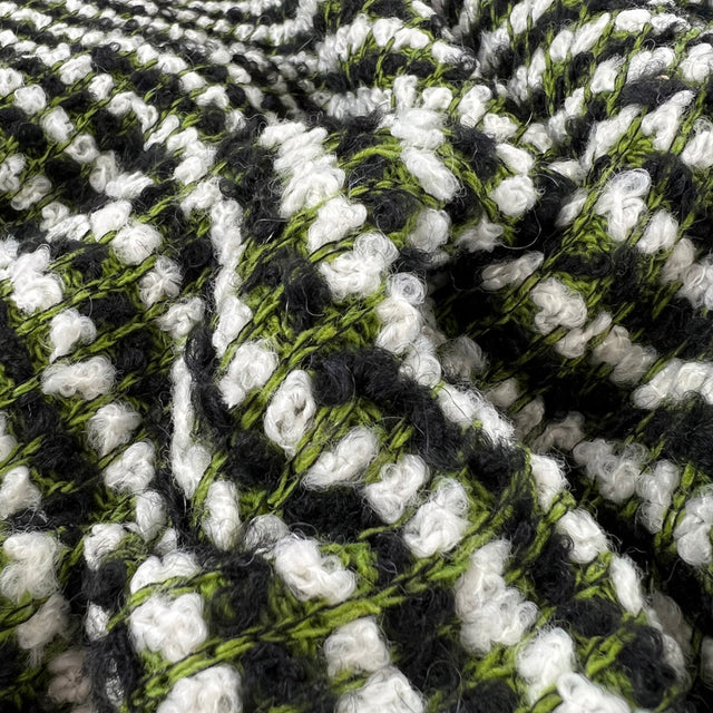 A bold 145cm wide boucle fabric with black, white and green yarns that gets more interesting the more you look at it.