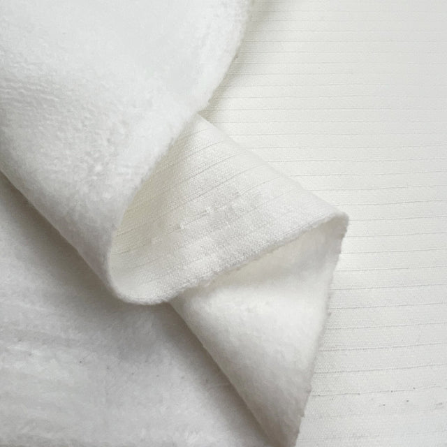 Discover the warmth and comfort of this 100% cotton fabric in soft white, featuring a rib knit pattern and brushed on one side for a super soft feel. This fabric is both substantial and cosy, making it a perfect choice for creating garments that offer comfort and durability.