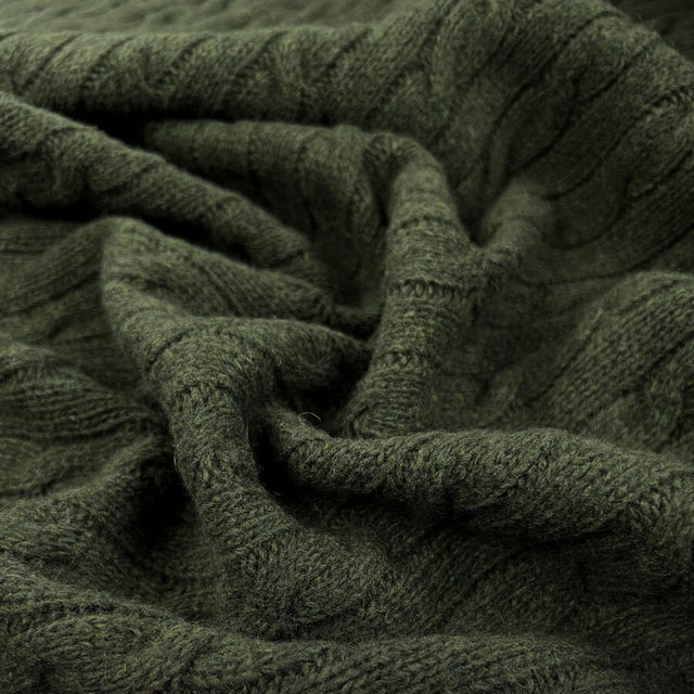A luxurious 149cm wide, 100% lambswool cable-knit fabric in olive green, crafted in Italy by a prestigious family-run mill known for its exceptional quality.