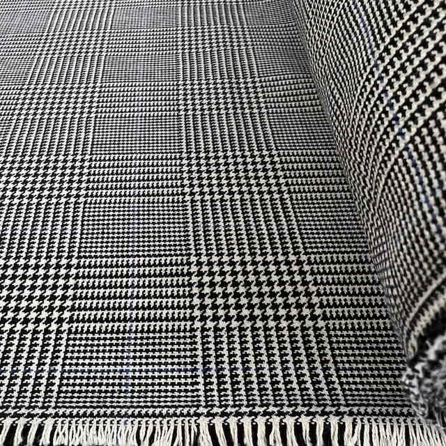 Our black and white dogtooth check cotton suiting fabric has a delicate blue overcheck, ideal for waistcoats, trousers, shawls, dressmaking and skirts! 154cm wide, this cloth features a different patterned weave in each check square, creating a unique and individual piece of fabric - especially with the addition of the super fine blue overcheck. Warm, soft, durable and cosy, this fabric is perfect for Autumn/Winter fashion – get it whilst you can! |