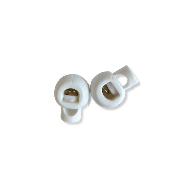 Pack of 2 18mm wide white spring cord locks/toggles, perfect for locking cords in place on coats, anoraks, sweatshirts, jogging pants, bags and more.