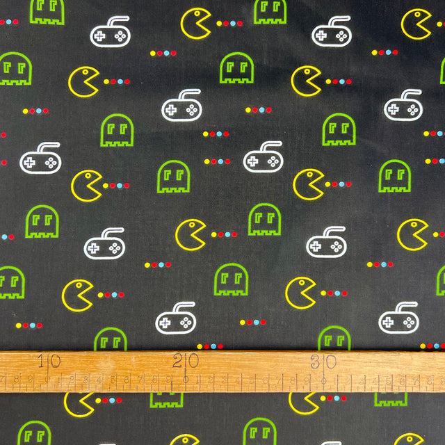 Step back in time with our 112cm wide printed poly/cotton fabric, featuring a nostalgic retro Pacman game design. Embrace the vintage vibes and create unique projects that pay homage to a classic arcade game.