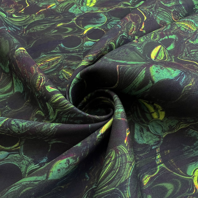 Cotton and spandex blend sateen fabric with a digitally printed abstract marble effect in black and green. This interesting design is reminiscent of paint pouring that bubbles and marbles as the green and black paint mix. The fluid print is perfect for men’s shirts, women’s dresses and children clothing!