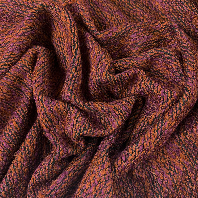 This lovely chunky knitted boucle fabric features a solid black knit reverse with loosely woven burgundy and rusty orange threads and yarns.