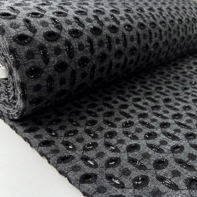 A stylish 140cm wide, 52% viscose, 25% linen, 23% polyester broderie anglaise fabric in a black shade, offering breathability and a touch of texture.