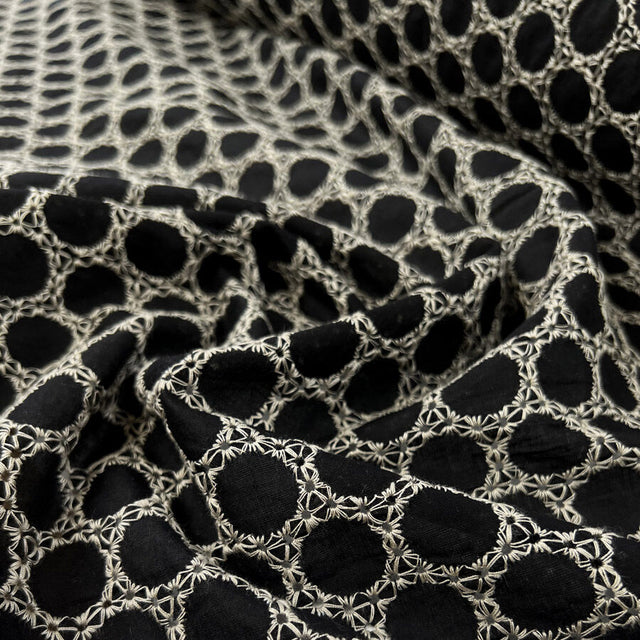 A striking 133cm wide, 100% cotton broderie anglaise fabric in black with intricate beige embroidery, offering a delicate yet bold aesthetic.