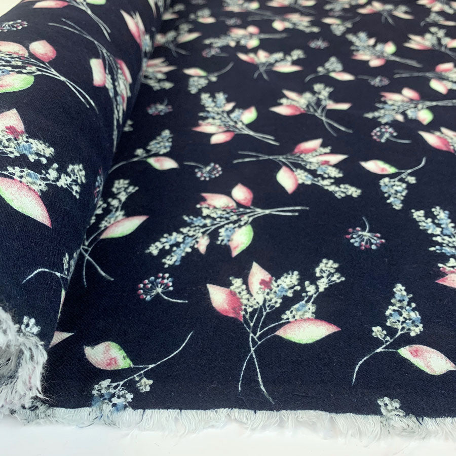 Lightweight brushed cotton shirting, wonderful for dresses too. With a soft hand and lovely finish, this one comes with an all over Elderberry like design in ivory, pale blue and pink on dark navy ground. There is no doubt this is trying to mimic a Viyella cotton, a fabric of bygone era. It doesn't quite get there but nonetheless, it is still very nice. See our full Autumnal Equinox brushed cotton range here. |