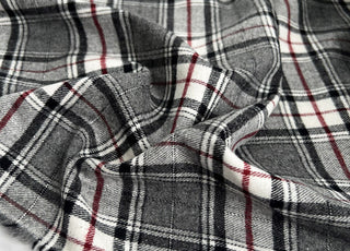 High-quality brushed cotton tartan shirting fabric, featuring a classic red, green, and white check pattern.