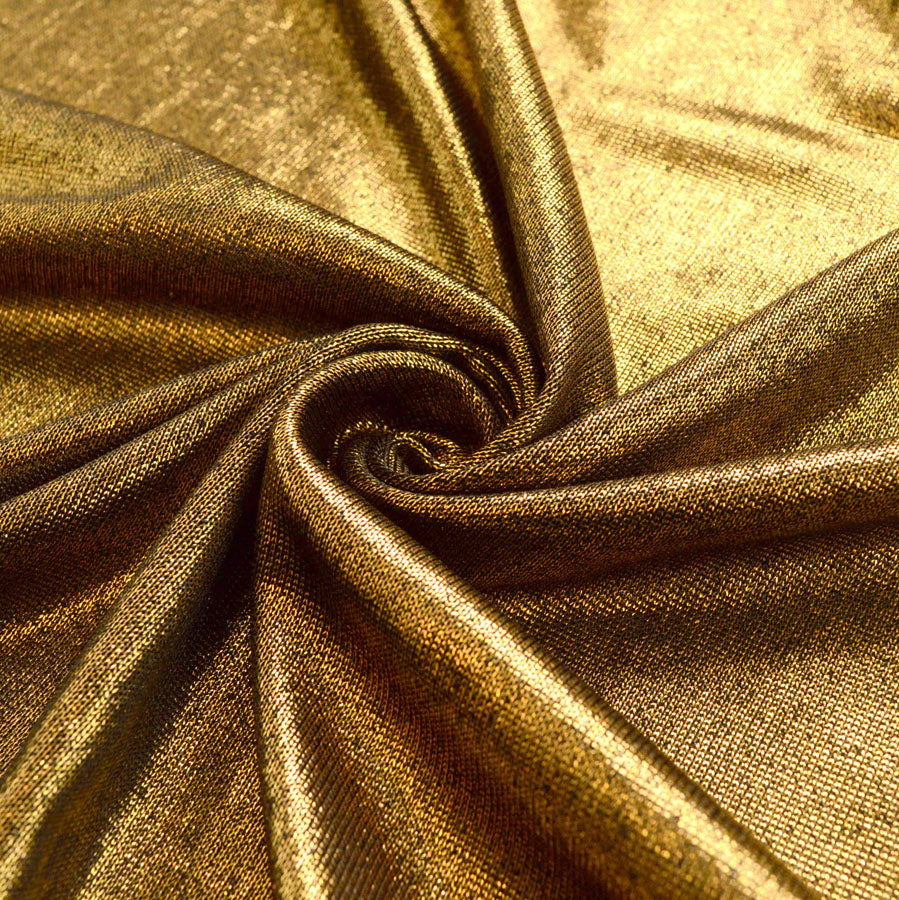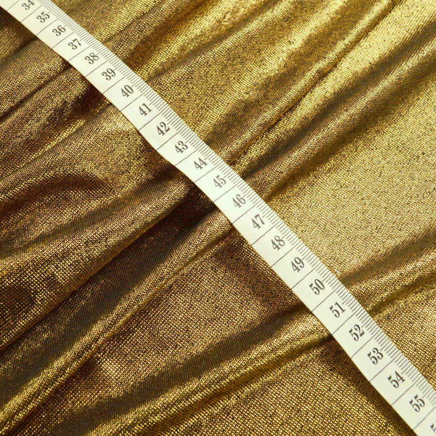 Gold knitted jersey fabric. This is a fine jersey which drapes and looks like liquid gold. It has a huge stretch and recovers completely. The best use for this is a top. The gold does migrate slightly so I wouldn't use this for a skirt that you want to wear 100 times. Great for special occasionwear.