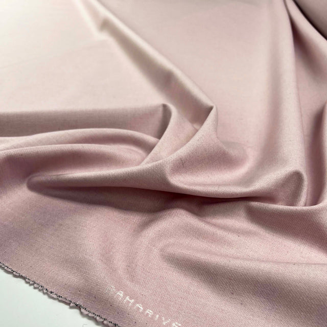 This pale pink wool blend suiting has a softly brushed finish that gives it a smooth, slightly cosy handle without feeling heavy. The surface is clean and even, with a subtle warmth that makes it comfortable to wear while still looking smart.