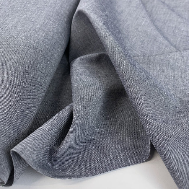 This 100% cotton chambray has a soft navy blue hue. Our lightweight cotton fabric is a great choice for dressmaking & quilting. At 110 gsm this is densely woven and sits between a poplin and a lawn weight.