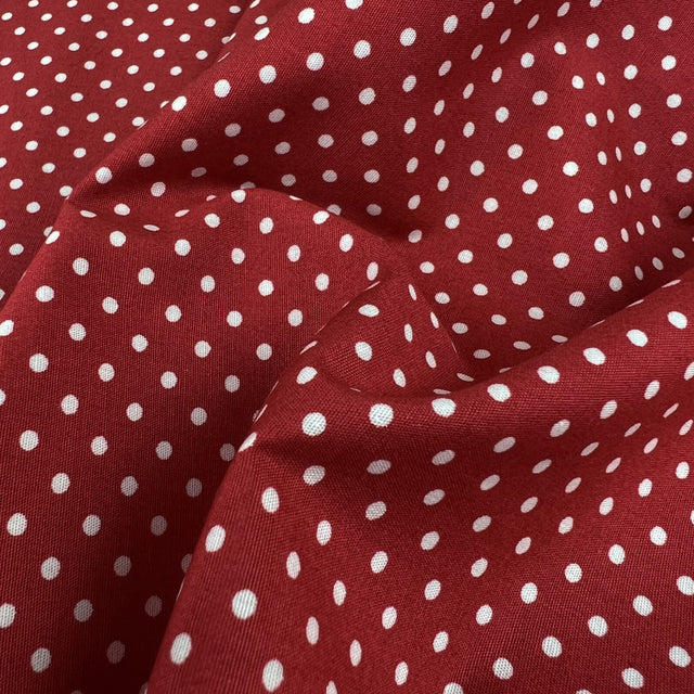Our vibrant 112cm wide spotted cotton poplin fabric is perfect for your next sewing or crafting project. This fabric features a bold and eye-catching bright red hue and is adorned with delicate soft white polka dots, creating a fun and playful design.