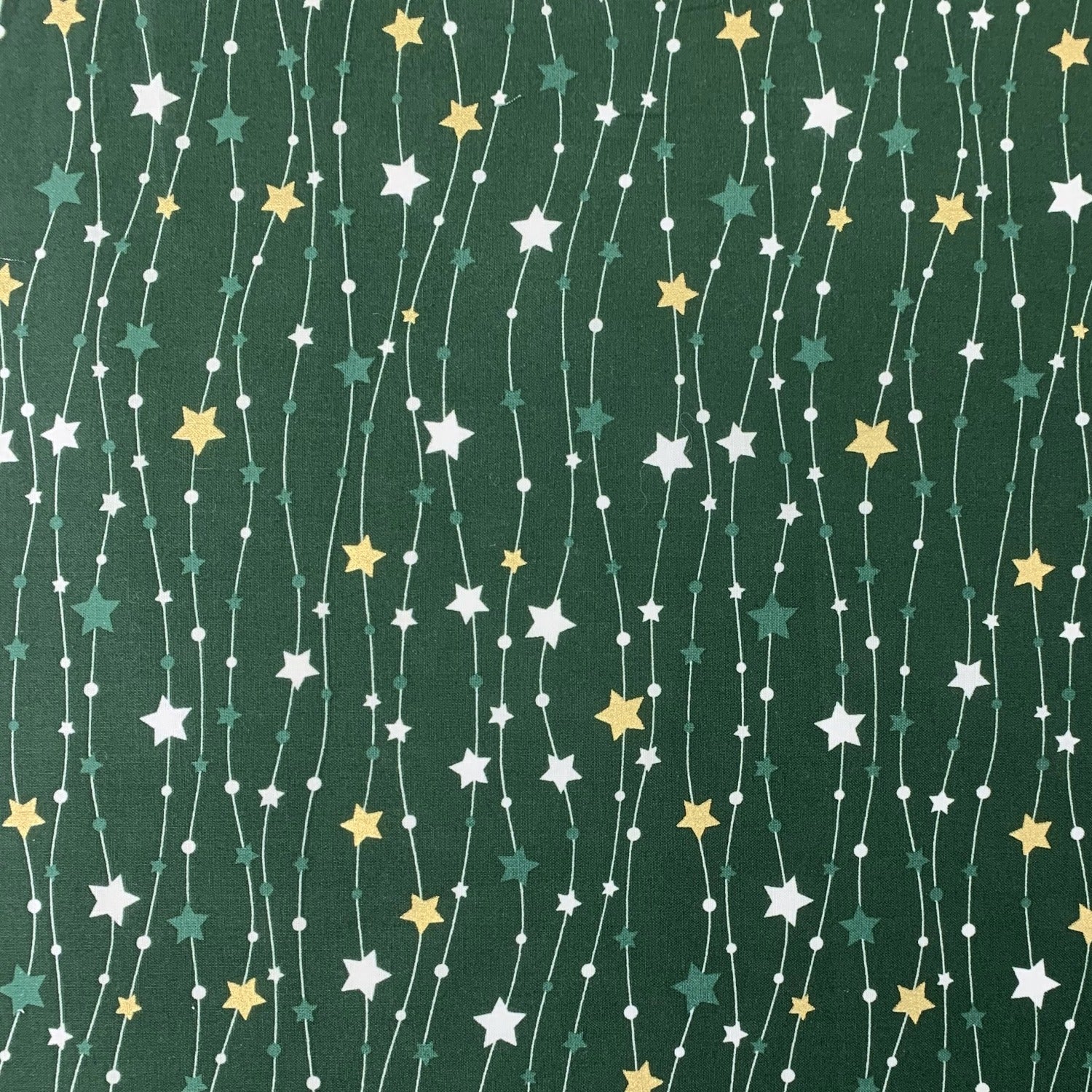 | 140cm wide good quality cotton poplin fabric with stars and circles in gold, white and green on a forest green ground. Good for Christmas decorations & crafts. | |
