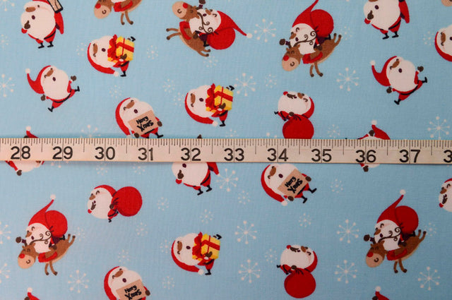| 148cm wide 100% lovely quality cotton craft cotton. This Christmas print comes in blue with an all-over flying Christmas Santa print fabric. | |