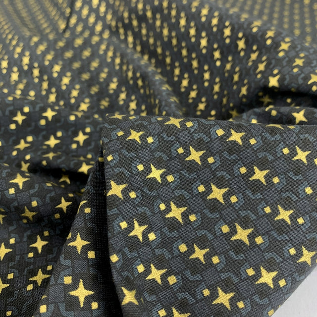 Designed in Denmark and printed in Japan. Superb quality Stof Japanese craft cotton with a Christmas print of gold stars on a geometric pattern in black and dark grey.
