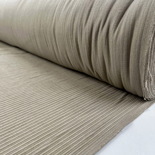 150cm wide, thick 100% cotton 6 wale corduroy fabric in a pale stone shade. Woven in Italy, this durable and high-quality fabric is perfect for crafting timeless garments and accessories.
