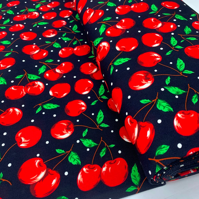 | Superb cherry print cotton stretch twill fabric for trousers and dresses. Made with 98% cotton and 2% elastane with just enough give for all the comfort you need.