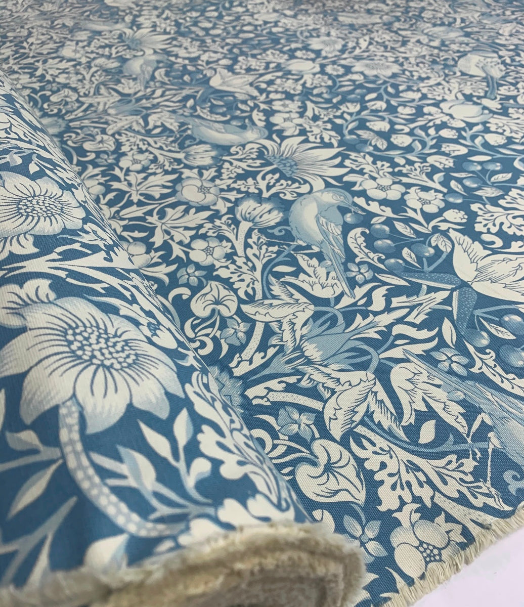 152cm wide, Cotton canvas fabric with a duck egg blue and pale cream design inspired by William Morris. Suitable for blinds, curtains, and cushion covers.