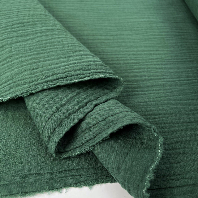 A beautifully soft and breathable 100% cotton double gauze fabric in a rich pine green shade. At 135cm wide and 126gsm, this Oeko-Tex Standard 100 certified cloth is lightweight yet cosy, with a softly crinkled texture that adds natural movement and charm. Double gauze is made from two fine layers of cotton tacked together, offering gentle structure without bulk, perfect for garments worn close to the skin.