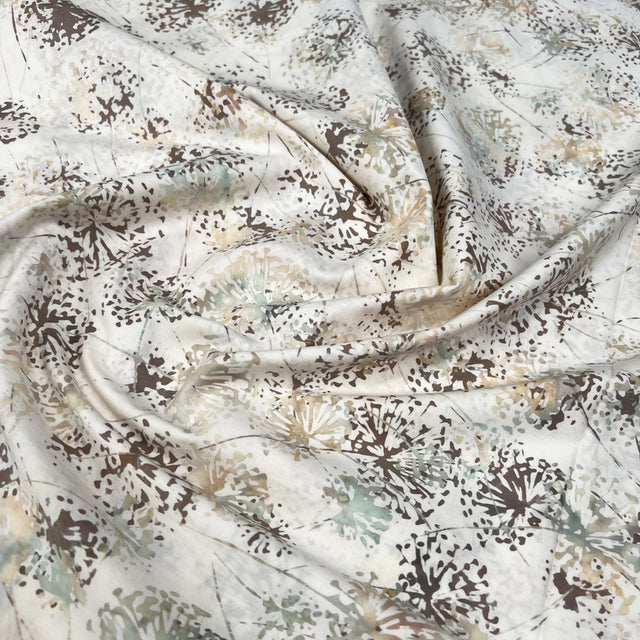 A gentle, light-toned version of the dandelion design, this Hoffman Bali cotton lawn is set on a soft cream base with layered seed heads in warm brown, muted sage and pale sand. The batik-style background adds subtle movement, so the print feels organic rather than sharply defined.