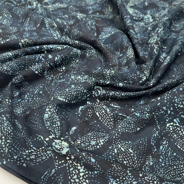 A rich navy ground sets the tone for this Hoffman Bali cotton lawn, overlaid with softly outlined florals in layered shades of blue. The batik-style printing gives the surface depth and movement, with petal shapes appearing almost etched against the darker base.