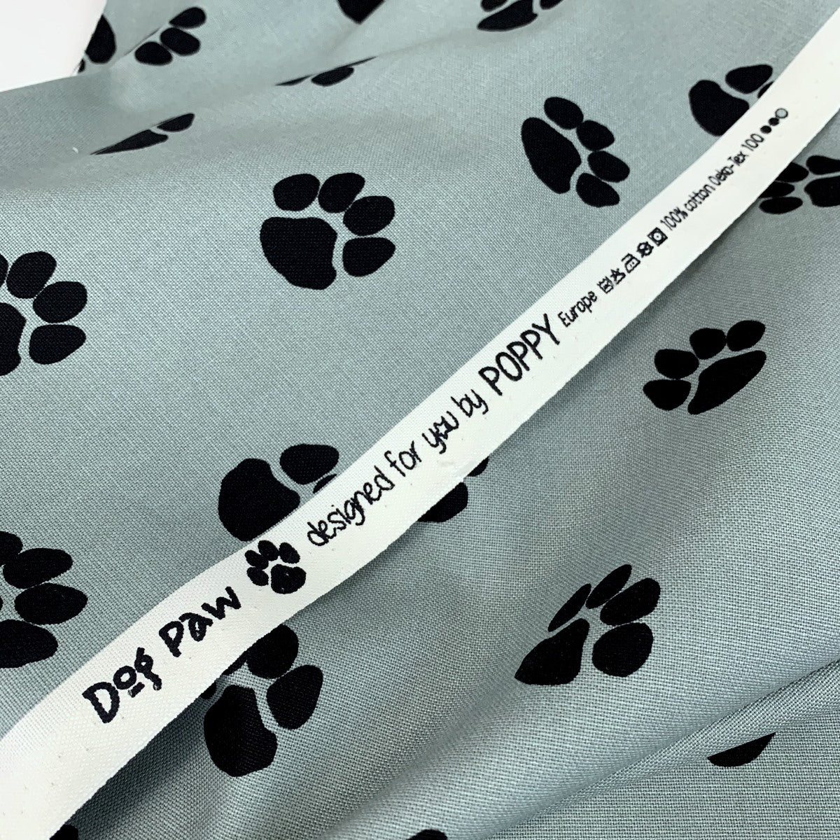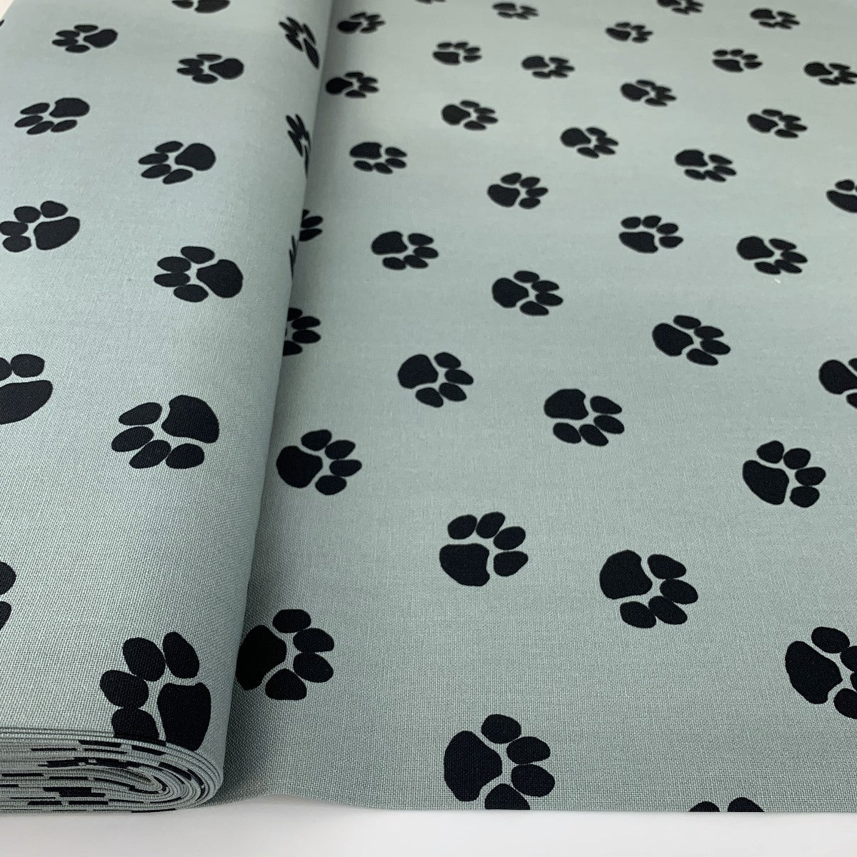 142cm wide cotton cotton canvas by John Louden with an all over paw print on a duck egg background. Approx. 225gr/m²