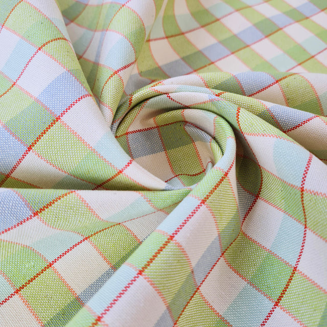 This is a fantastic 138cm wide, cream, blue and green checked cotton fabric with a fine border in burgundy and pink.