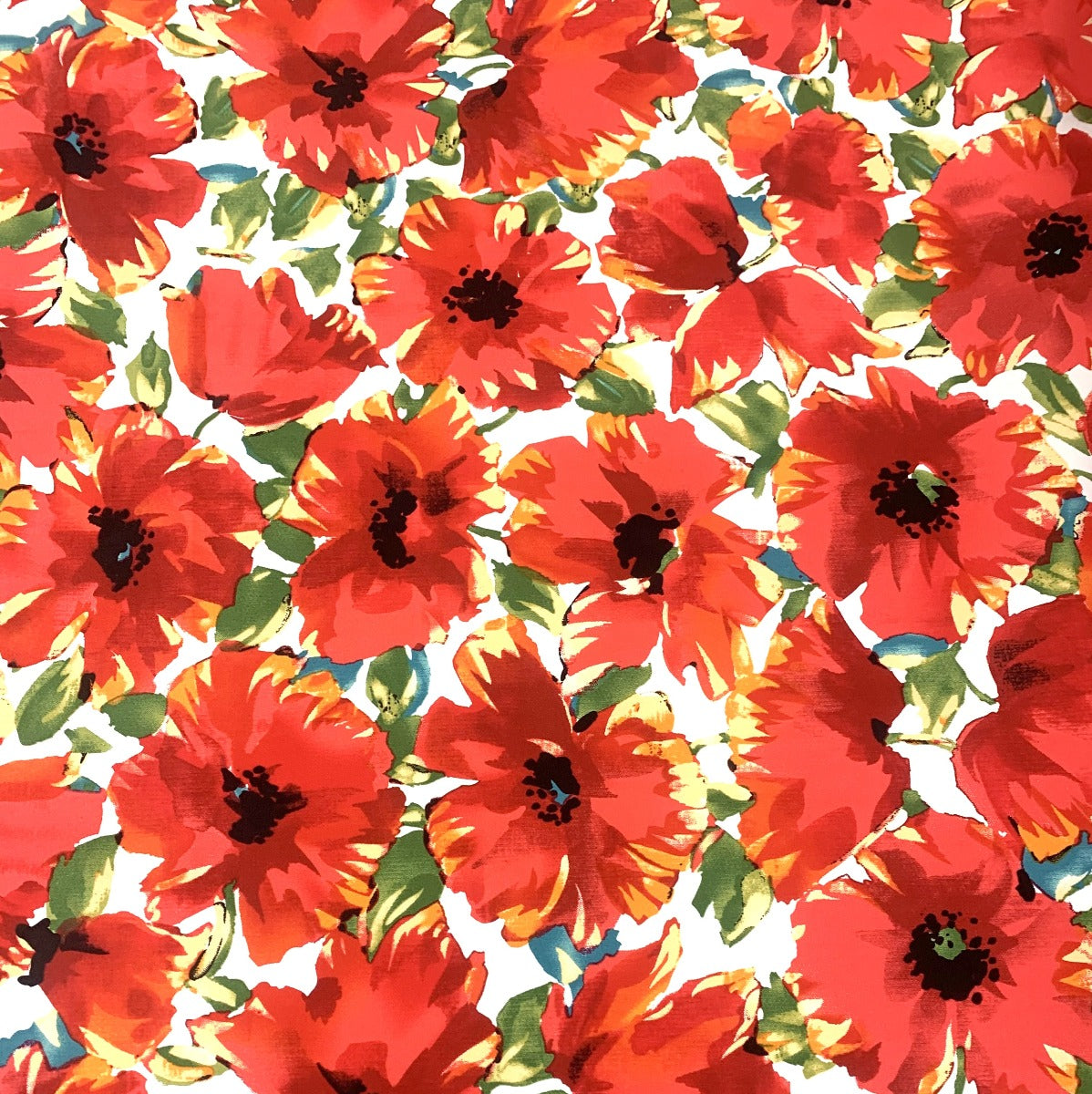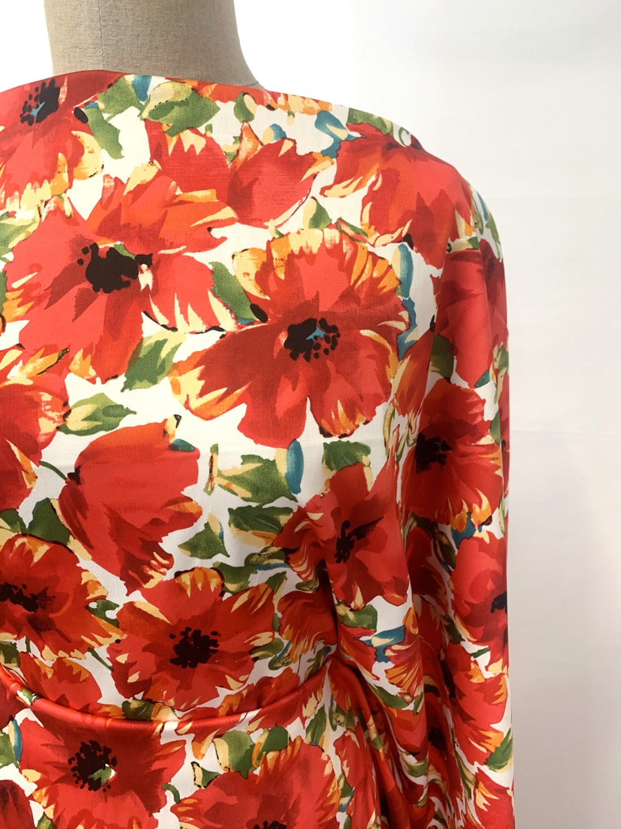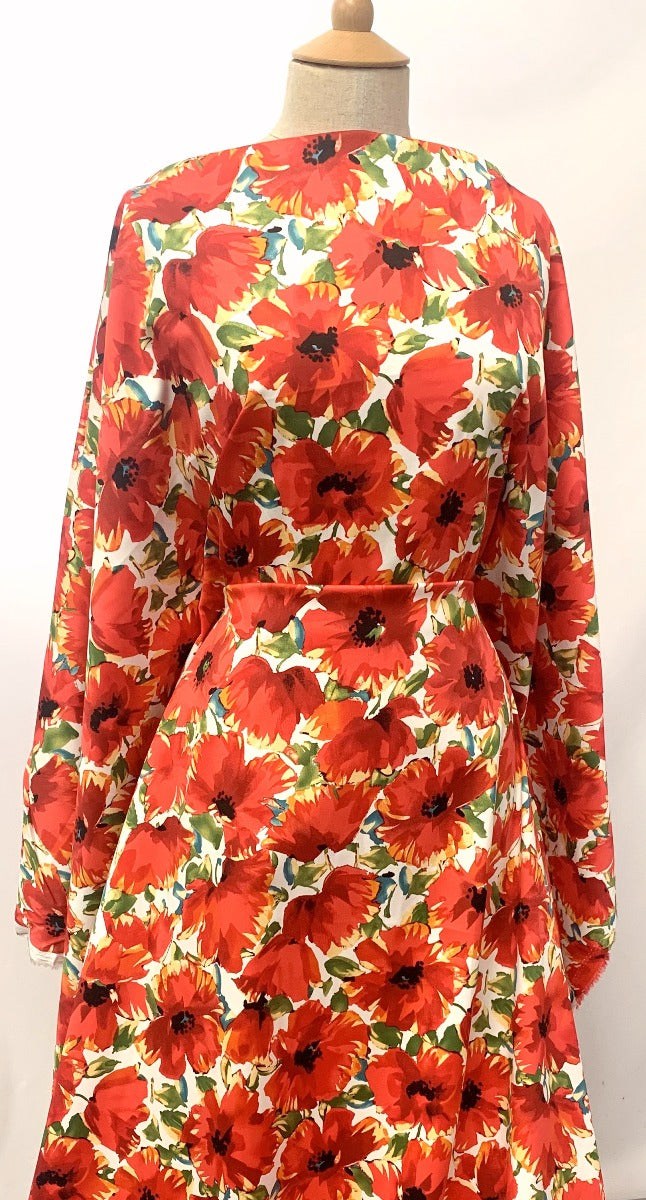 Cotton elastane dress and trouser fabric in white with a large red and green floral print. A soft dress fabric, this is not a stiff cotton and has a 'washed' finished so is a little bit softer than a normal cotton elastane trousering. Good for skirts, dress and trousers.