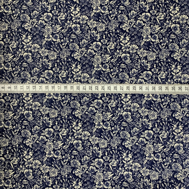 Good quality, 100% printed cotton poplin fabric with a dark navy floral pattern on an ivory background. Poplin is great for shirts, dresses and craft. |