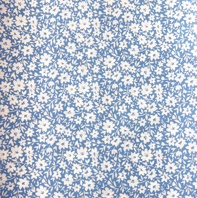 This is a great quality pale blue floral polycotton craft fabric featuring an all-over white floral print on a blue background.