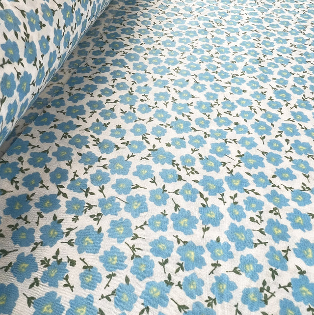 This is a great quality white craft polycotton fabric featuring a delicate blue floral print with green leaves!
