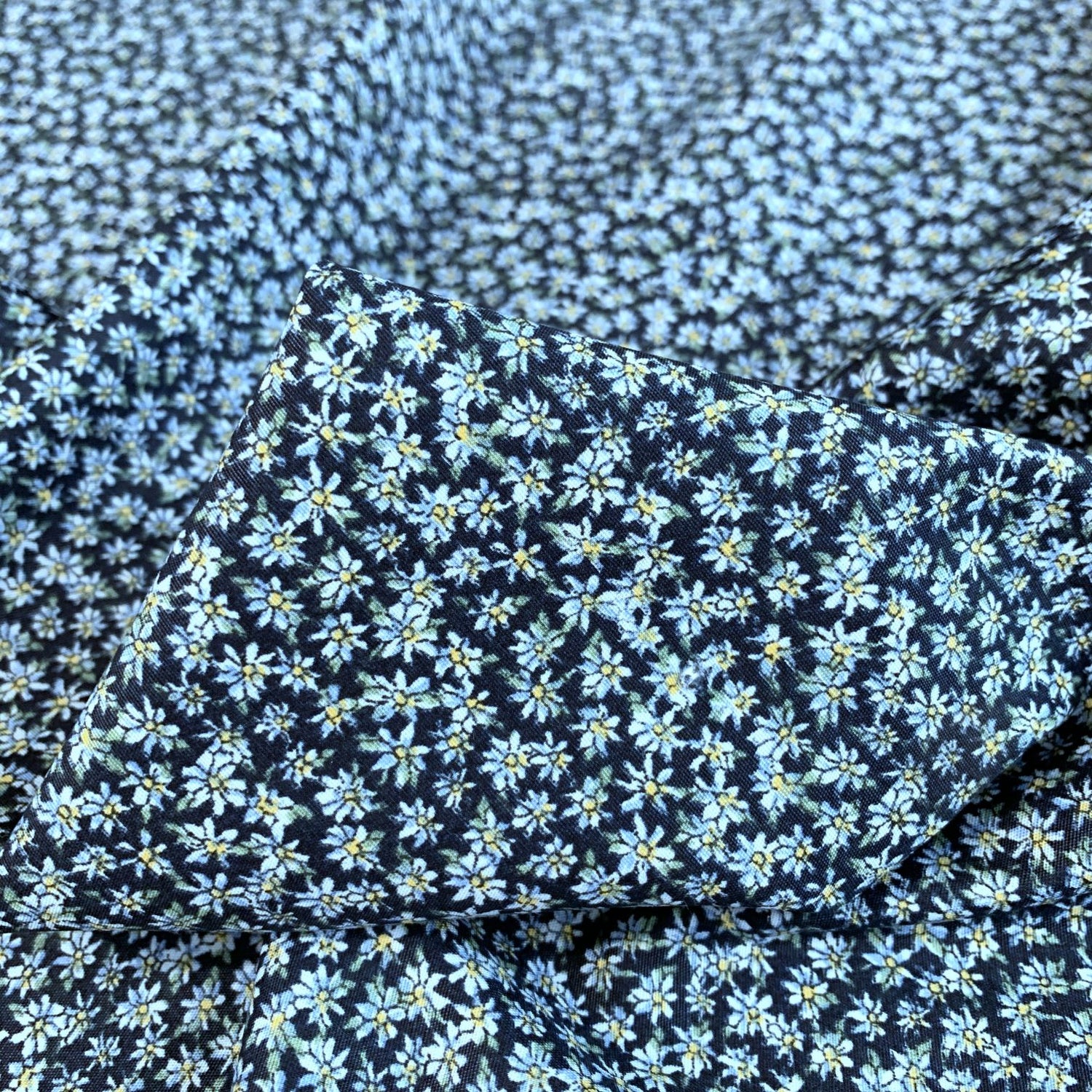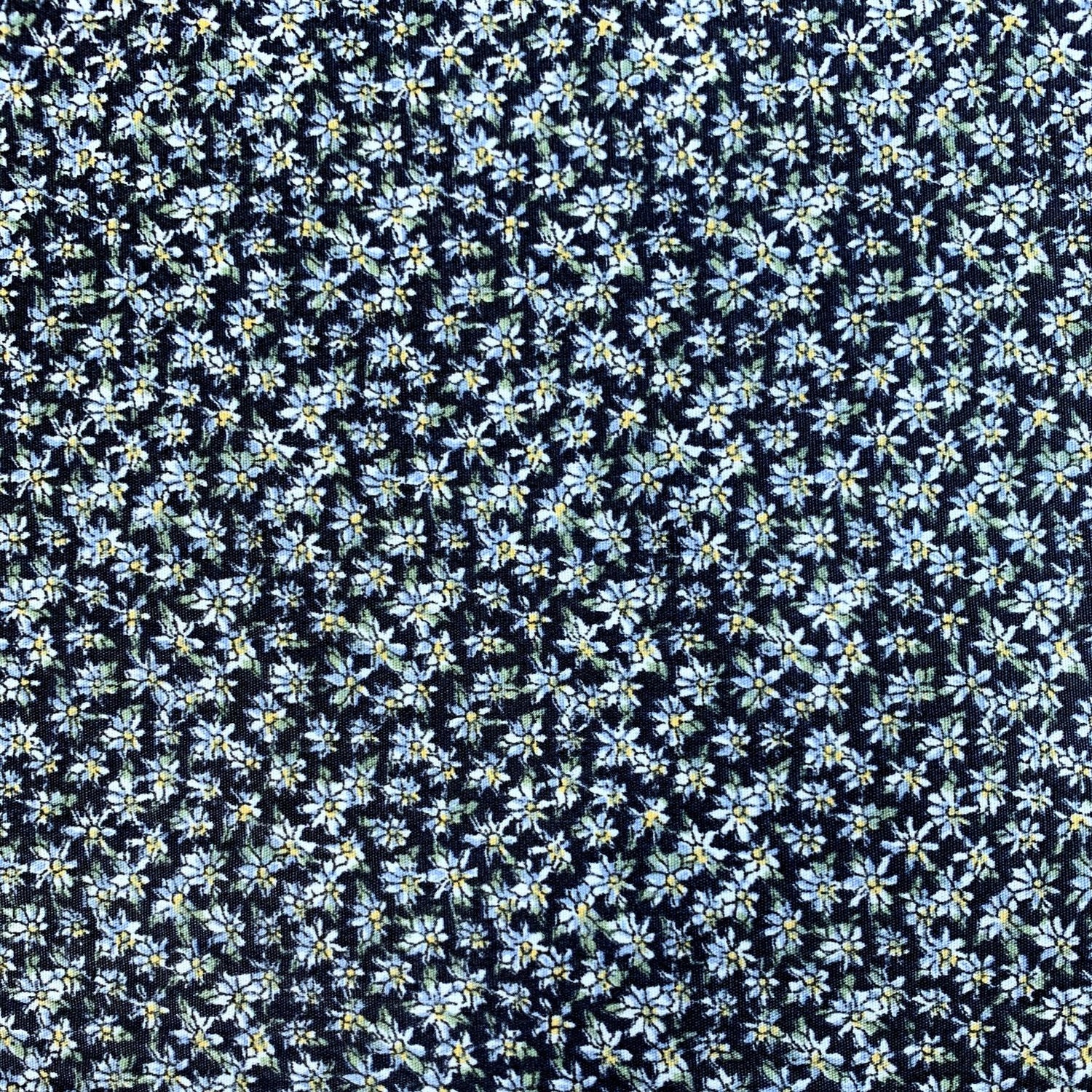 100% cotton poplin fabric with tiny flowers on a navy background.