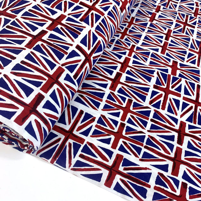 Cotton craft fabric with Union Jack print in red, white and blue. Ideal for bunting, table covers, masks & craft projects.