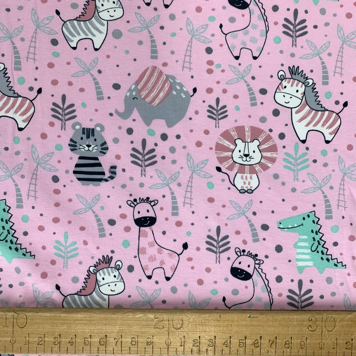 | OEKOTex® standard premium quality printed cotton elastane jersey fabric in a baby pink animal zoo print 144cm wide, at 220gsm² it is solid enough for leggings and perfect for dresses and tops, baby grows, and soft washable bibs. Very soft and beautiful to handle, the 5% elastane gives it good recovery. It washes wonderfully too. | |