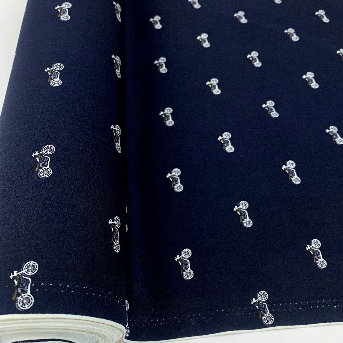 Lovely quality combed cotton poplin which means that his is very smooth and soft hand and is ideal for dresses, shirts and craft projects. It comes in in dark navy with motorcycle/bikes design. Easy to sew and match so suitable for most dress patterns. |