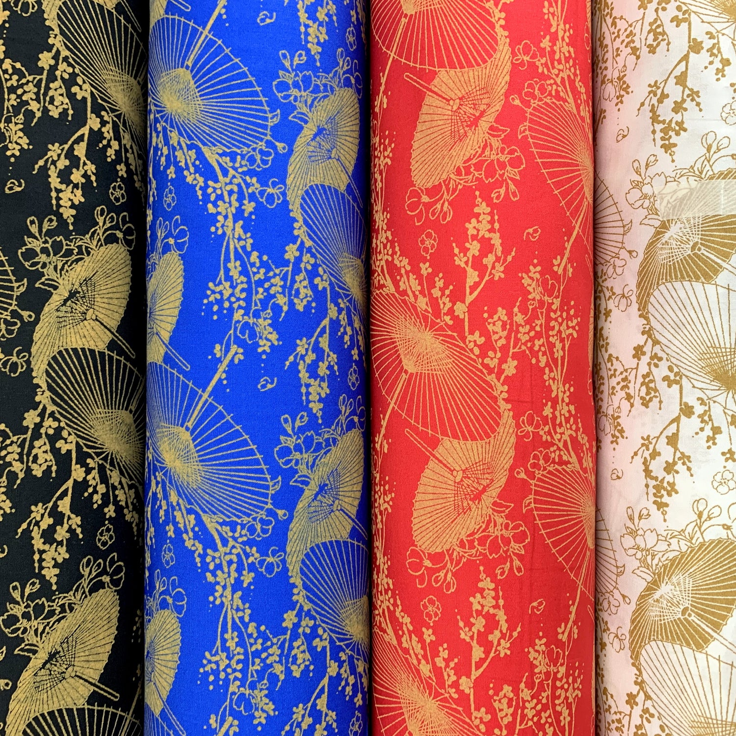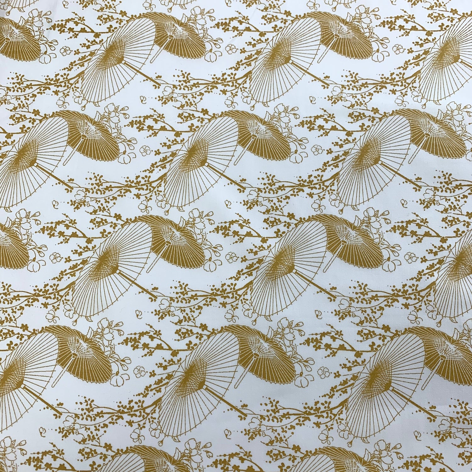 | Here we have a collection of Chinese parasol print fabrics in wonderful colours. This one is 115cm wide cotton poplin print fabric in cream with an all over gold parasol print. Poplin is great for shirts, dresses and craft. | |