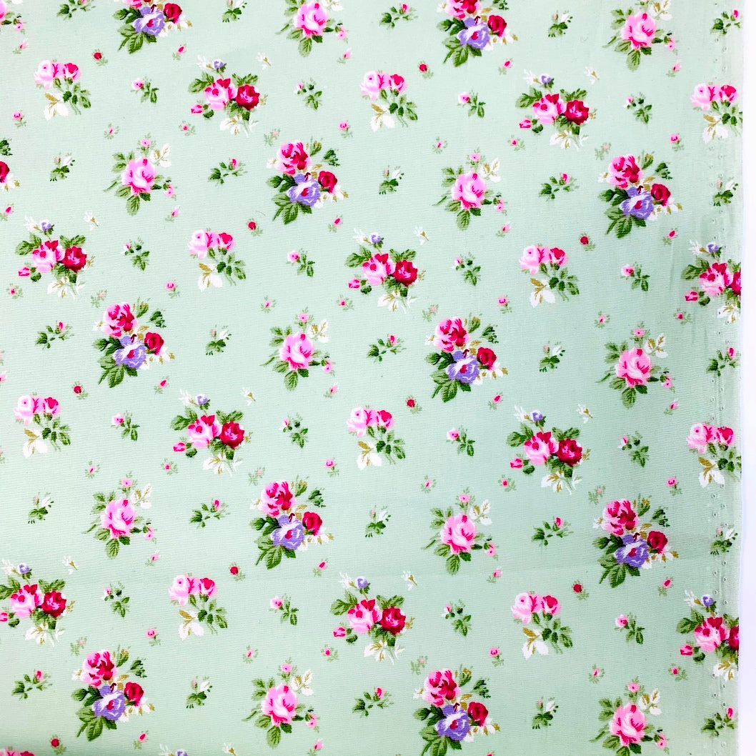 112cm wide, Floral cotton craft and dress fabric Super quality cotton poplin fabric which has a lovely soft hand perfect for dressmaking and crafts in a lovely pink floral on a pale green ground.