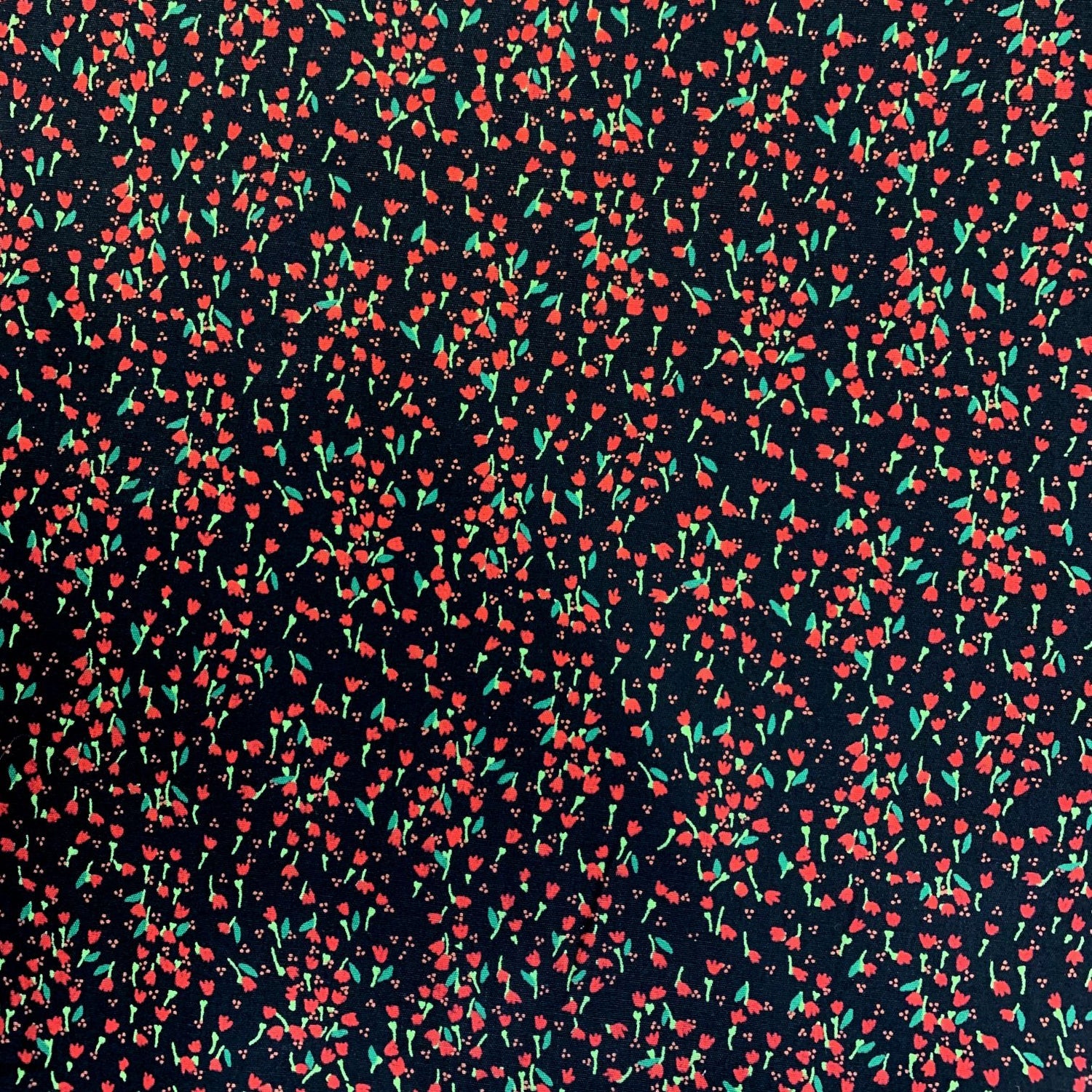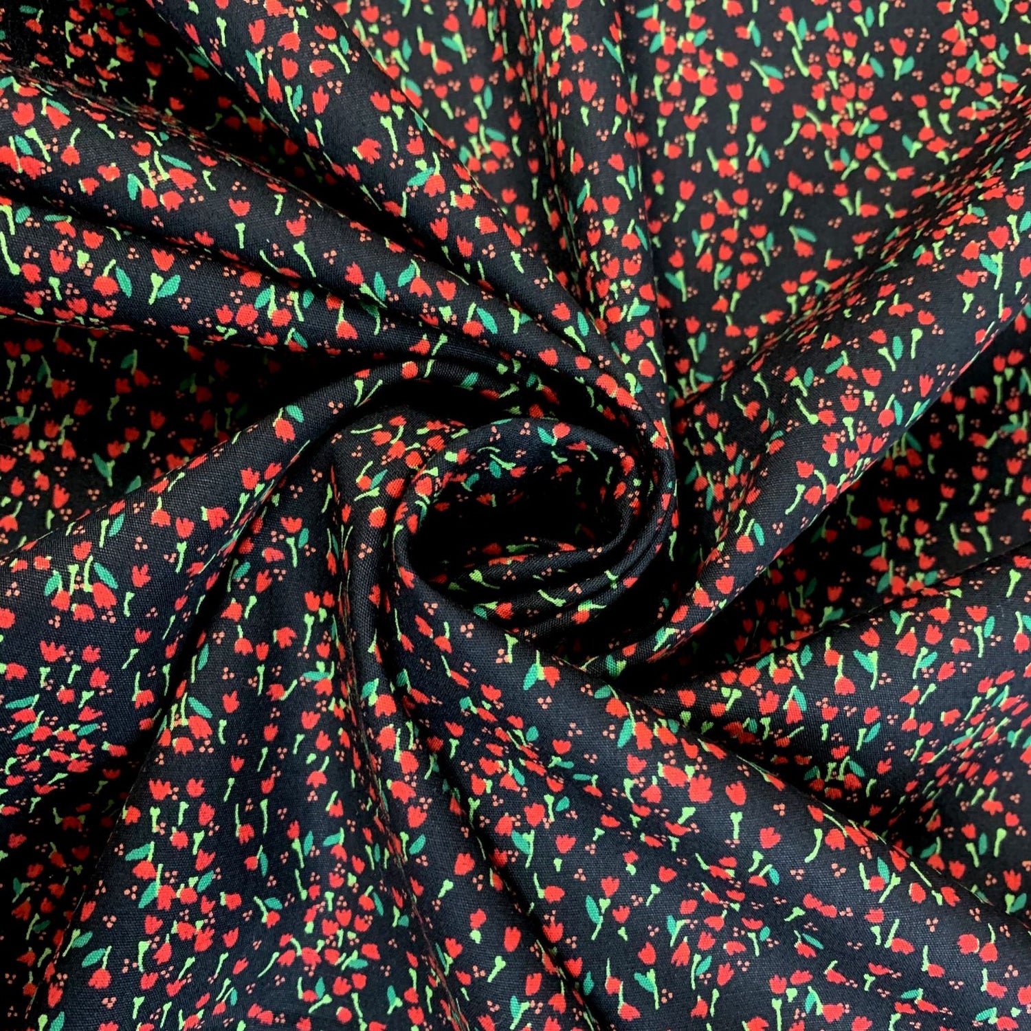 Cotton poplin dress fabric with an all over red flower print on a black background. Perfect for making dress & crafts.