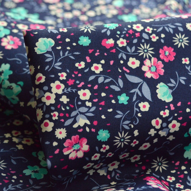 This bright floral printed cotton poplin is very, very pretty. Lots of pretty pink and turquoise coloured flowers with white flowers dotted in between, on a dark navy background. Nice and busy, full of flowers. Use this for blouses, dresses, nightwear and crafts.