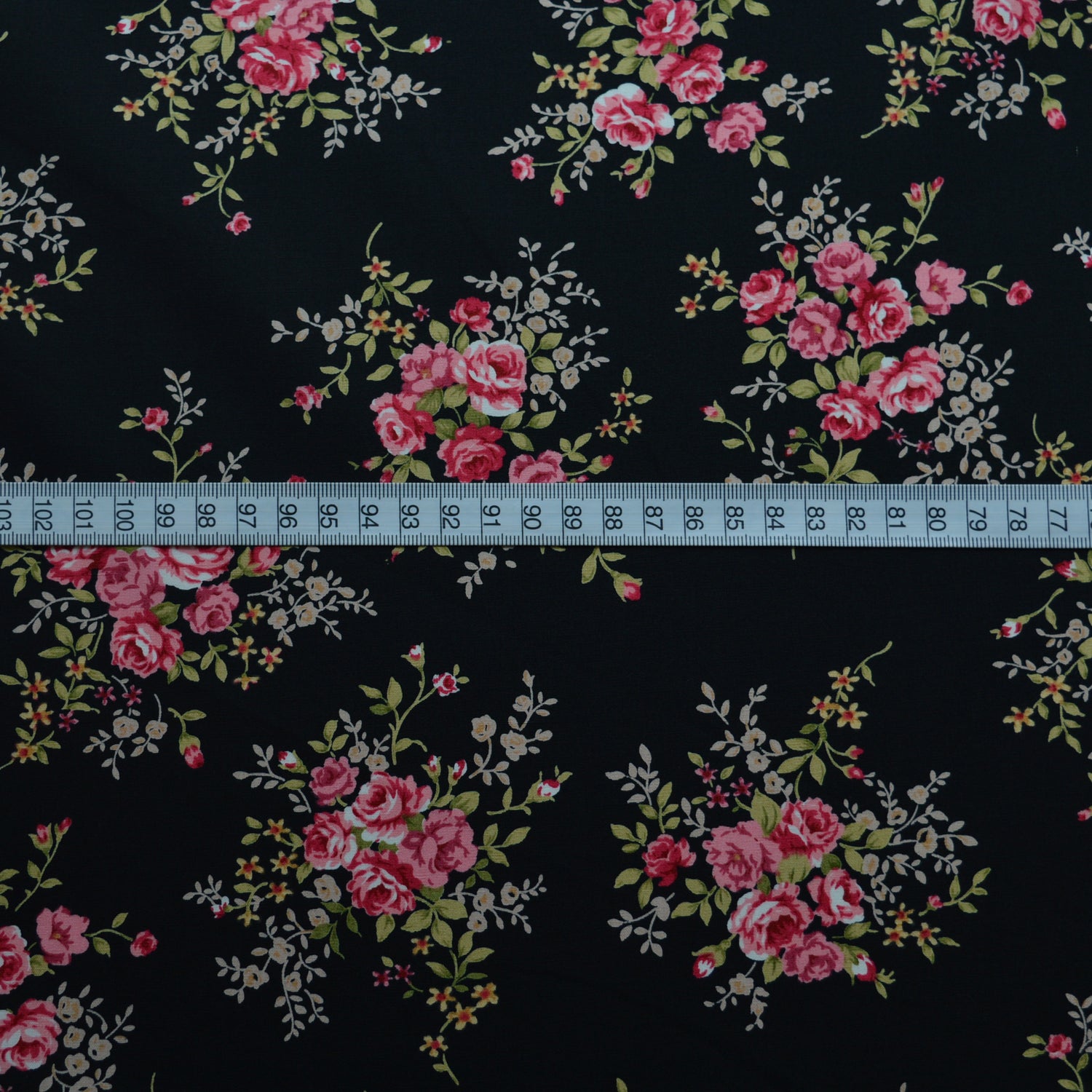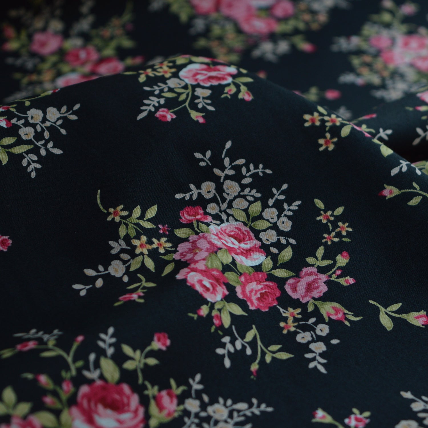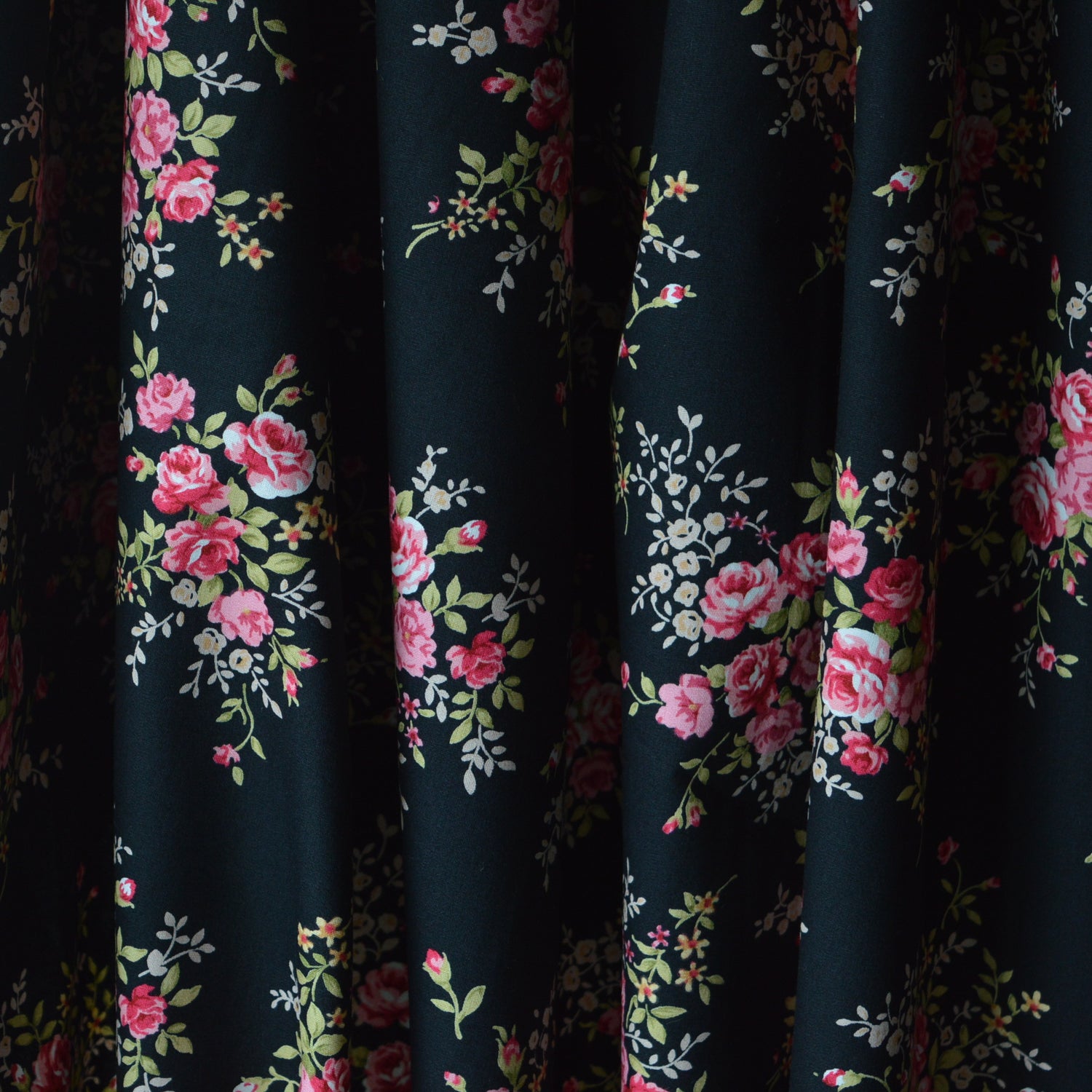 | 112cm wide cotton poplin fabric with a pink beige and green small scale floral cluster print on a black back ground. A good seller. Approx 121gsm |