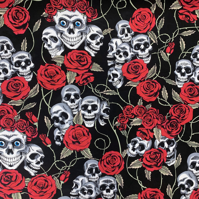 114cm cotton poplin dress and craft fabric with white skulls and vibrant red roses.